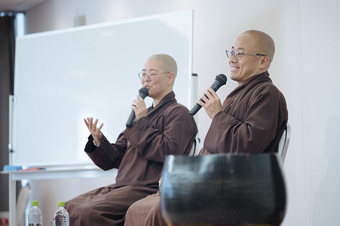 講演をするブラザー・ファプ・ユン(右)と、通訳をする日本人尼僧のシスター・チャイ