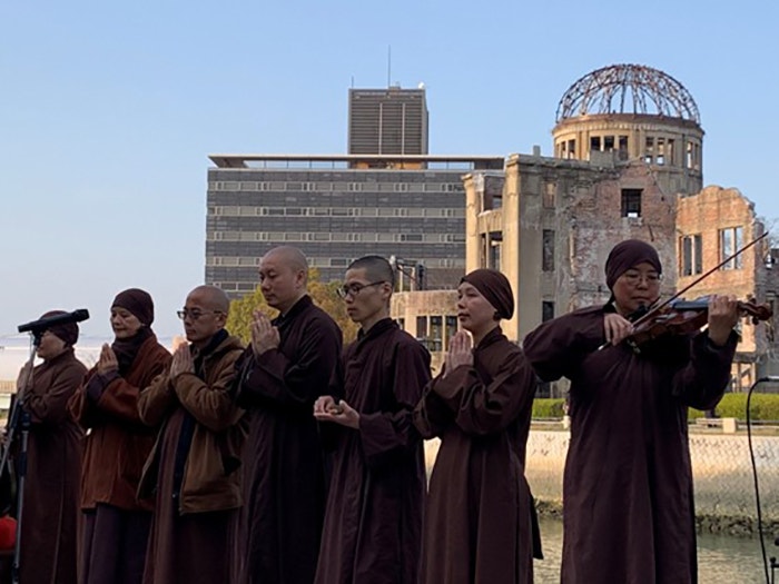 原爆ドームの前でチャンティング。被爆バイオリンを奏でるシスター・チャイ。