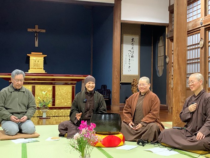 イエズス会聖ヨハネ修道院では神父(左)やシスター、キリスト教の黙想実践者らとマインドフルネスのプラクティスを分かち合う集いが開催された。修道院は1938年に建築された和風建物で聖堂は畳敷、被爆後は救護拠点となった。