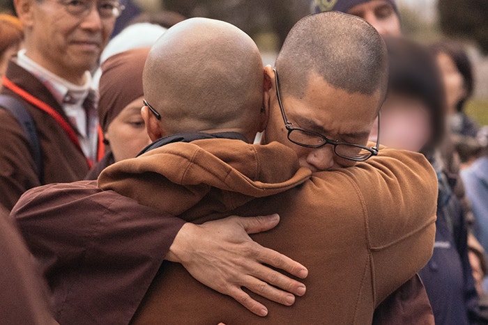 平和公園で歩く瞑想終了後、ハグをする僧侶方。