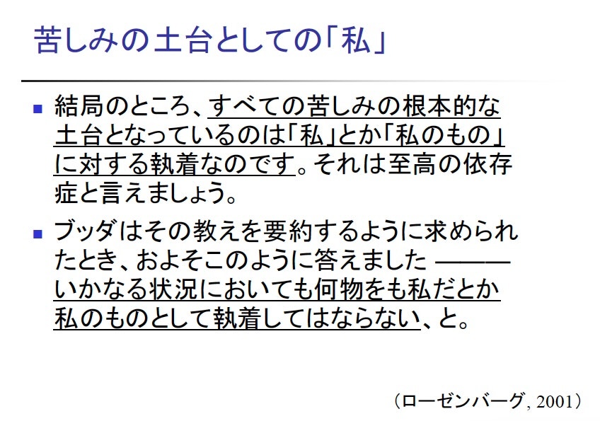 「結局のところ、すべての苦しみの根本的な土台となっているのは「私」とか「私のもの」に対する執着なのです。」