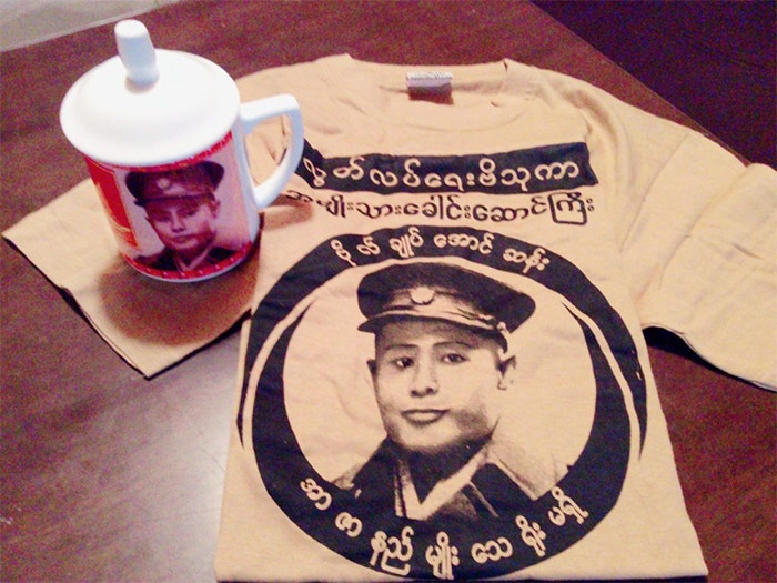 ミャンマー独立の父・アウンサン将軍のTシャツとマグカップ。