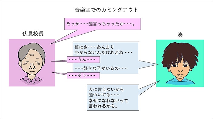 (保利先生に関して)なぜ嘘をついたのか? 「好きな子がいる」が、人に言えないからである。本当のことを言うと「幸せになれない」と言われるからである。――子供らしいたどたどしい言い方ですが、これが嘘の理由についての説明であり、性的指向についての婉曲なカミングアウトでした。