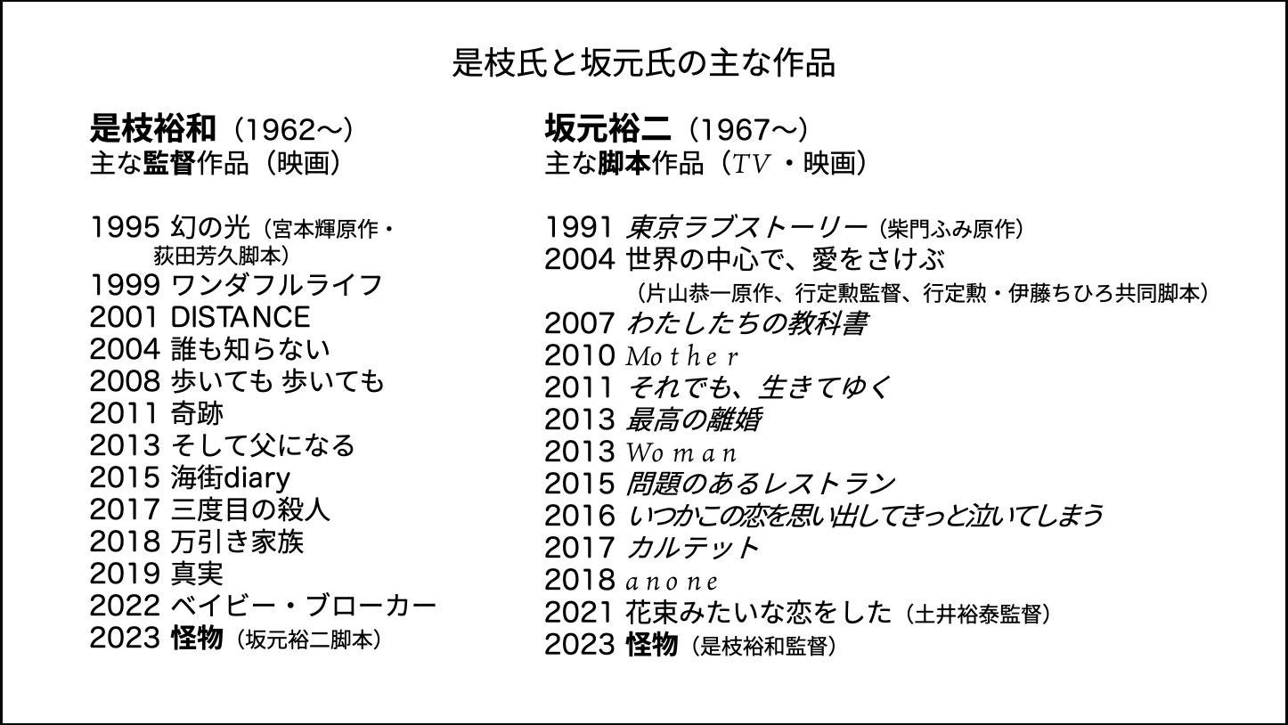 2023年公開の日本映画『怪物』をご覧になった方はどのくらいおられるでしょうか? 是枝裕和監督と脚本家の坂元裕二氏のコラボ作品ですが、お二人がそれぞれなさってきたお仕事の、どちらにとっても集大成のような内容をもつ、珠玉の名品です。