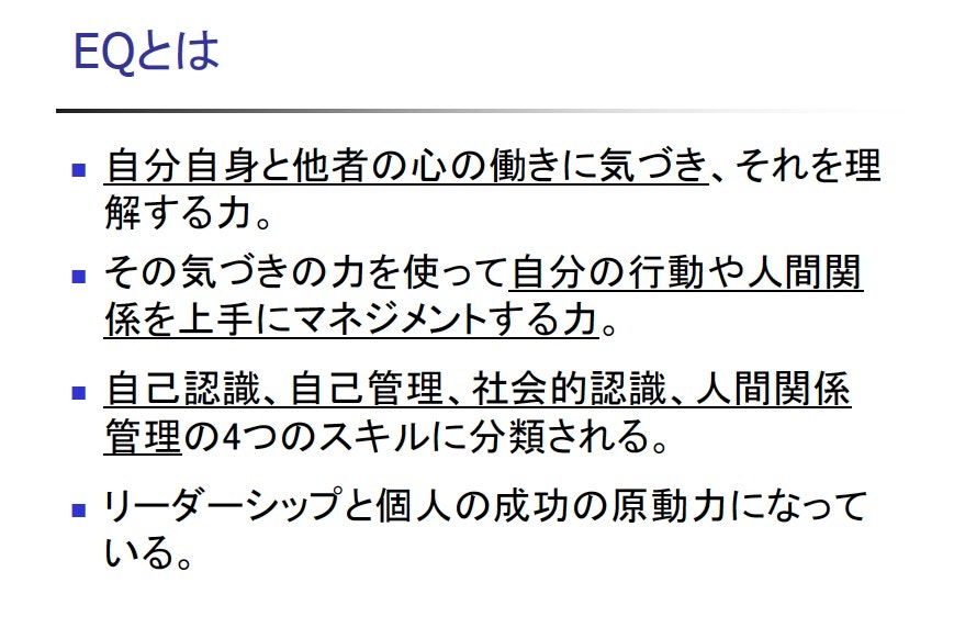 上から4つ目のポイントとして、EQは「リーダーシップと個人の成功の原動力になっている」とあります。現代社会は非常に不安定で、過去のように会社や他人の言うことにただ従っていれば安泰だった時代は終わりました。今や、他人の意見は必ずしも当てにならず、会社自体が存続するかどうかも不確かです。そのような状況では、個人が自らをしっかりと確立し、自立することが不可欠です。