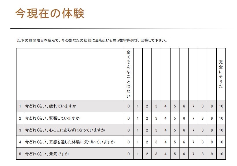 皆さん、こちらの〔今現在の体験を測る5つの質問項目〕に答えてみてください。簡単な5つの質問ですが、これに答えることで、自分の今の状態がよく分かります。ぜひ挑戦してみてください。